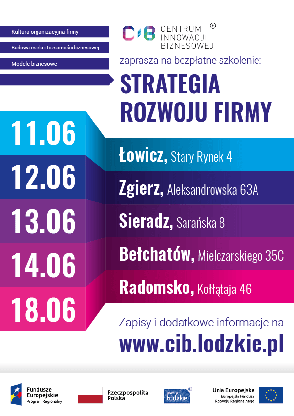 Urząd Marszałkowski Województwa Łódzkiego zaprasza przedsiębiorców sektora MŚP do udziału w bezpłatnych szkoleniach, które odbywać się będą od czerwca do września 2018 r. w Sieradzu, Łowiczu, Zgierzu, Bełchatowie oraz Radomsku.